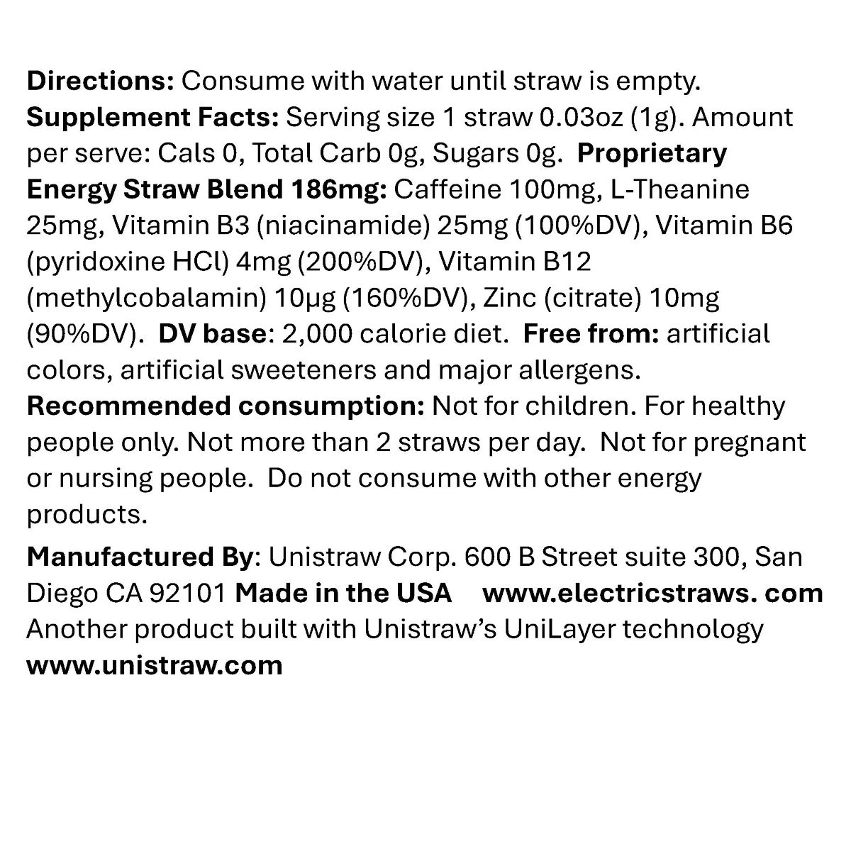 Electric energy straws redefine daily supplementation and energy support with an innovative blend that combines the benefits of dietary supplements and energy enhancers. Expertly formulated with Vitamins B₃, B₆, B₁₂, Zinc, and a precision-engineered 4:1 ratio of caffeine (100mg) to L-theanine (25mg), each straw provides smooth, balanced, jitter-free energy without the sugar crash or artificial additives typical in conventional energy drinks and coffee.